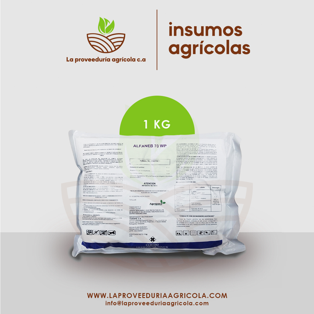 La Proveeduría Agrícola te ofrece ALFANEB 70 wp ( Propineb) ) es un fungicida foliar preventivo y de contacto en polvo mojable (WP) con 70% de ingrediente activo. Se utiliza para controlar un amplio espectro de hongos en cultivos, actuando multisitio para evitar resistencias. Protege contra enfermedades como gota, tizón y mildiú, requiriendo aplicaciones preventivas.