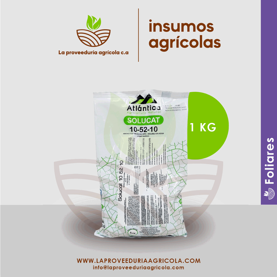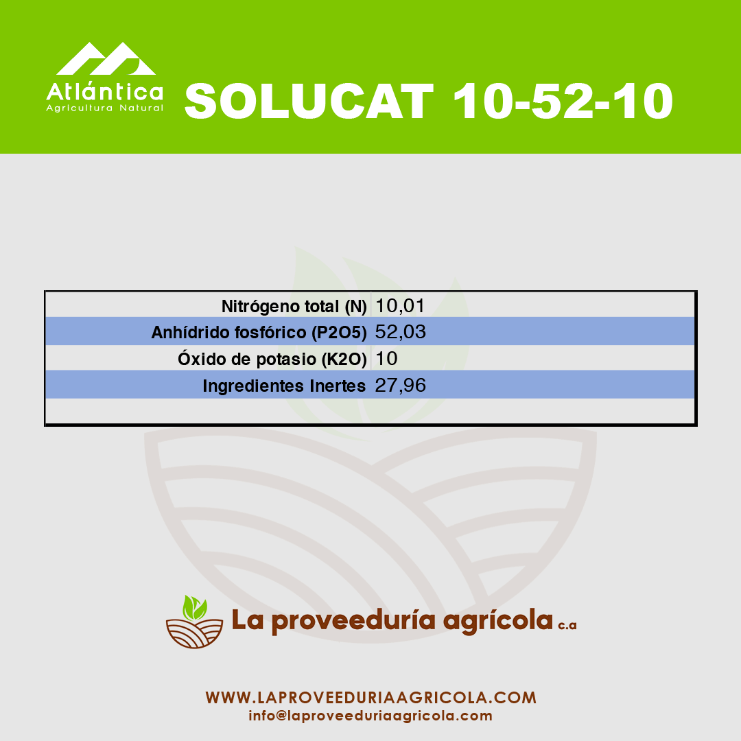 La Proveeduría Agrícola te ofrece Solucat 10/52/10, es un abono foliar que contiene los tres elementos esenciales para nutrición de las plantas, nitrógeno, fósforo y potasio. Dichos elementos aseguran un nutrición adecuada en aquellos cultivos que demandan grandes cantidades de nutrientes. Se puede aplicar por goteo o edáfica.