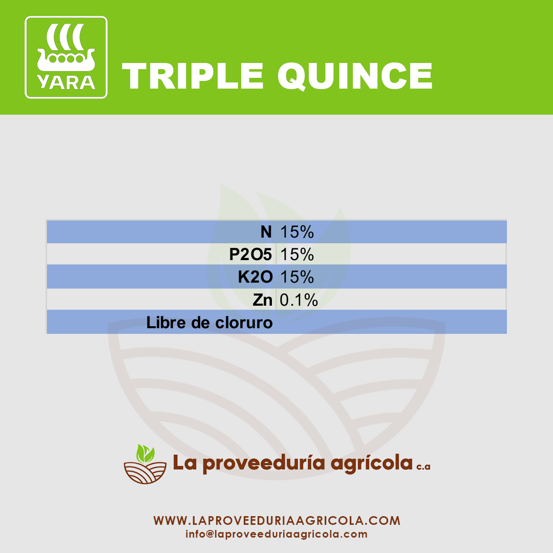 Yara TRIPLE QUINCE es un fertilizante completo NPK balanceado en estos tres elementos, tiene la característica de ser denso perlado y esparce eficientemente a mano y con fertilizadora.